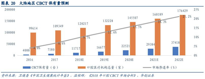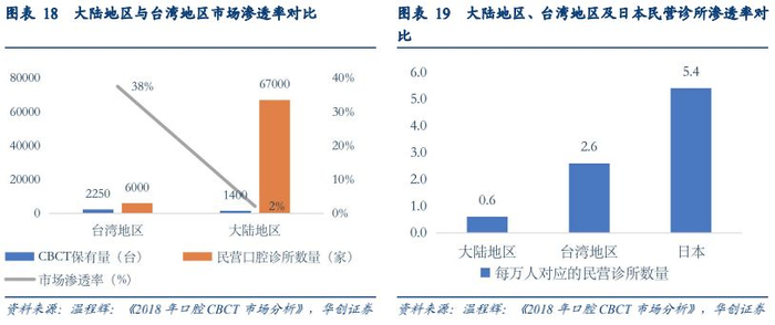 未来我国口腔CBCT行业存量加增量市场空间将超百亿元。从CBCT的市场渗透率上来看,2014年大陆地区CBCT的保有量仅有1400台,2016年整个行业CBCT机保有量为4000台,其中口腔CBCT的约在2000台左右,在总共9.9万家口腔医院中的市场渗透率为4%。根据公开数据整理得出,至2018年底,CBCT的市场渗透率约为9.7%,且市场渗透率以每年3-4%的速度在增长。对比来看,台湾地区有 6000 多家民营口腔诊所,其中2000-2500家配备 CBCT,渗透率约 33-42%,大陆地区市场渗透率仍有很大的提升空间。