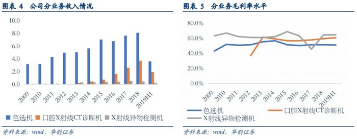 公司的三大产品中,色选机业务一直居于主导地位,收入占比稳定,2018年底收入为8.1亿元,占总营业收入的65.4%,是公司的支柱业务;高端医疗设备的占比逐年提升,2018年末的收入达到3.7亿元,占到总收入的29.93%,是公司未来几年的重点发展业务;而工业检测设备营业收入规模较小。从产品的营收增速来看,口腔X射线CT诊断机自研发投产以来,营收增速一直保持在40%以上,增速较快,远居其他业务之上,充分体现了公司“聚焦三大板块,重点发展医疗”的发展战略。公司毛利率维持稳定,过去几年保持在50%左右。2019年Q2毛利率为55.37%,同比上升0.43%。分业务来看,色选机业务的毛利率保持在50%左右;口腔X射线CT 诊断机的毛利率从2012年的37%上升到2018年的60%。