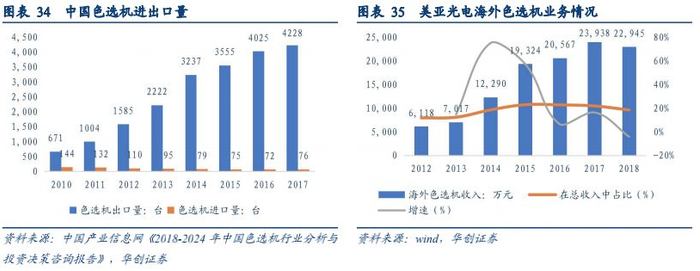 2、加快海外市场的扩张,预计成为色选机市场增量的主要动力近年来,我国色选机进口量逐年上升,而色选机的出口量在逐年下降,说明我国的色选机设备发展迅速,已经在海外市场占据了一定地位,未来海外市场的扩张会成为色选机市场增量的主要动力。美亚光电2018年底的海外收入达到2.3亿元,占到了总收入的18.5%,近5年复合增速为26.7%,海外市场发展迅速。目前,美亚光电在东南亚、中亚、中东、北美、南美、西欧、东欧、非洲等地区为近百个国家提供高品质的光电识别解决方案,全球超 3 万家客户正在使用公司制造的产品,美亚在东南亚地区的市占率已位列第一。2019年4月,美亚光电海外首个办事处——南亚办正式揭牌成立,以此为依托,美亚将携手合作伙伴进一步强化当地营销、服务网络建设,进一步提升客户体验,打造美亚精准服务全球用户的示范工程。今后,随着对全球客户需求的研究不断深入,美亚光电还将陆续推动其它海外办事处的设立,加快全球市场布局,海外市场的扩张值得期待。