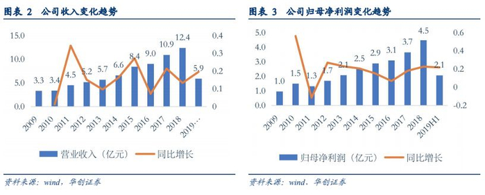 公司上市以来的营业收入呈现逐年上涨的趋势,从2009年的3.3亿元增长至2018年的12.4亿元,其中过去五年的年复合增速16.9%,公司归母净利润从2009年的1.0亿元增长至2018年的4.5亿元,过去五年年复合增速16.6%。2019年上半年,公司实现营业收入、归母净利润分别为5.9、2.1亿元,同比分别增长19.6%、21.8%。
