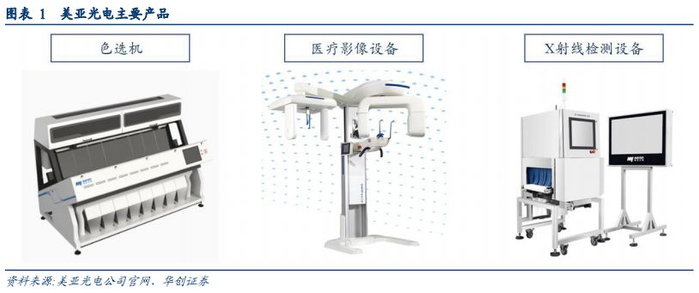 一、公司定位:中国光电识别行业领导者美亚光电是一家以光机电一体化技术研发为核心,专业从事光电检测与分级专用设备及其应用软件研发、生产和销售的高新技术企业。公司产品主要分为三类:一是色选机产品,主要包括大米、杂粮、茶叶等各类色选机品种;二是高端医疗影像设备,主要包括口腔CBCT以及椅旁设备,未来耳鼻喉和骨科CBCT也将陆续推出;三是X射线检测设备,主要包括X射线包装食品异物检测机、X射线安全检测设备和X射线轮胎检测设备等。、