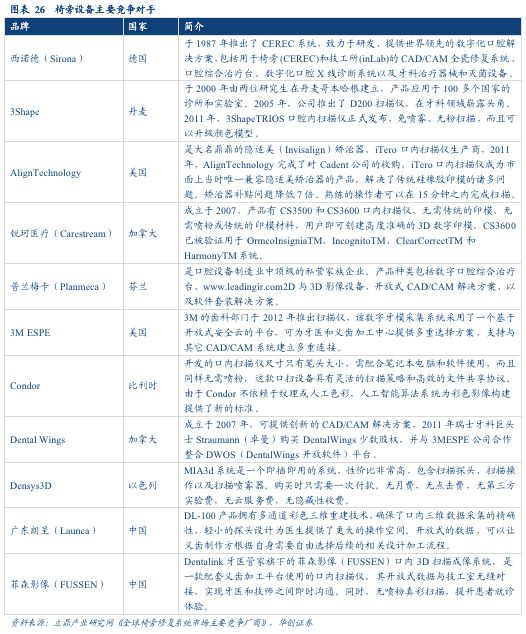 (二)椅旁设备市场空间广阔,有望打破国外主导地位,实现进口替代椅旁修复系统的进口依赖度较高,国产品牌起步晚,国内外椅旁系统的竞争格局主要由国外品牌主导。国外对于口内扫描仪的研究较早,最早投入市场的口内数字印模扫描仪是德国西诺德于1987年推出的CEREC系统,国际市场当中较知名的生产企业有德国Sirona、丹麦3-Shape、芬兰Planmeca等。