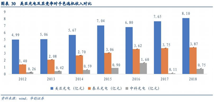 椅旁设备有望复刻CBCT的销售路径,迎来新的增长。椅旁修复系统相比CBCT,由于改变了医生的使用习惯,需要大量前期培训和后期跟踪指导,对服务的要求很高,因此在技术相差不大的情况下,国产品牌在服务响应上有天然优势;此外,椅旁修复系统由三部分构成,目前绝大多数厂商没有形成完整的数字化解决方案,只做其中的一部分,需要自己搭配成套,可能存在兼容性的问题。而美亚光电即将推出的椅旁修复系统为一套完整的系统,三个部分都包含在内,实现了产业链一体化。最后,美亚CBCT的成功推广已经获取了一大批稳定的客户来源,具有品牌和渠道优势,有益于未来椅旁设备的推广。耳鼻喉及骨科CBCT有望成为高端医疗影像板块的下一个增长点。公司耳鼻喉科和骨科两大类CT于2016开始投入研发,目前处于临床和认证阶段,有望在不久后投入市场。这两大类CT的单价远高于口腔CBCT,随着公司业务领域的拓宽,耳鼻喉及骨科CBCT的上市预计将成为公司未来新的增长点。四、色选机业务占主导,稳居龙头地位(一)色选机业务的竞争优势1、以色选机起家,成为我国色选机龙头企业美亚自2000年成立起一直致力于光电检测与分级专用设备的研发,以色选机业务起家,通过持续的研发投入和技术创新,已成为国内色选机行业技术领先、规模较大、品种齐全的厂商。从美亚光电及其竞争对手的色选机业务的销售收入来看,美亚的销售收入远远高于国内其它主要竞争对手,在国内的市占率多年保持第一位,是我国色选机的龙头企业。