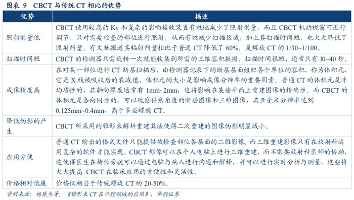 二、口腔CBCT业务前景广阔(一)CBCT优势明显,应用广泛1、CBCT简介及优势口腔CBCT(Cone Beam Computer Tomography),即锥形束投照计算机重组断层影像设备,其基本原理是采用三维的锥形束X射线源和二维的面状探测器,X线球管和探测器围绕投体做环形数字投照,依据机型的不同,环形旋转 180°或者360°后获得连续几百张的二维平面投影图像,然后将二维的投照数据重建后,由计算机配套软件直接形成三维图像。锥形束 CT系统主要由射线源、机械扫描机构、辐射探测器 、屏蔽设施和计算机等子系统组成。CBCT于20世纪90年代研发问世,于1999年进入中国市场。与传统螺旋CT相比,CBCT最大的优势是只需旋转一次即可获得重建所需的二维投影数据,可以直接重建三维图像,而传统CT的投影数据是一维的,重组的三维图像是用重建后的多个二维图像堆积而成。CBCT具有照射剂量低、扫描速度快、成像精度高、金属伪影小、应用方便、价格相对低廉等优点,这些优点使它在口腔临床中应用的越来越广泛。