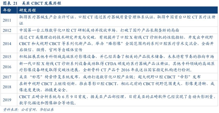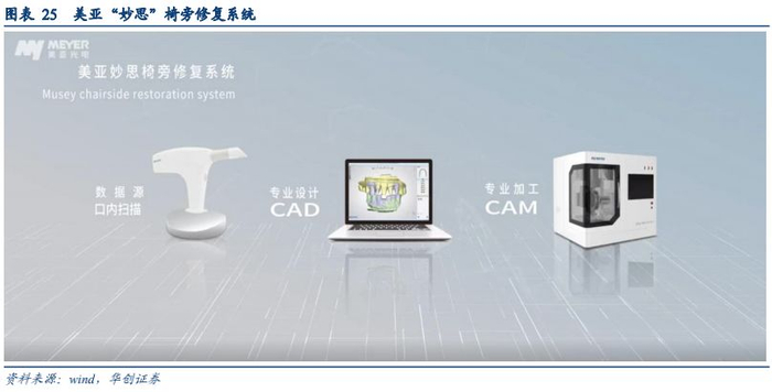与国外厂商相比,美亚在性价比和服务上具有巨大的优势。目前国内厂商在硬件和系统方面与国外系统相当,在技术得到保证的前提下,国产产品相比进口产品价格低1/2~1/3,具有较高的性价比。就美亚光电而言,一台CBCT的价格在30万元左右,而国外厂商的价格约在60万元左右。其次,美亚光电具有优良完整的服务体系:有经过培训的专业工程师教医生操作诊疗系统;线下有多个驻点,保证工程师在第一时间上门解决问题,同时通过先进的智能诊断平台,售后工程师可远程定位并诊断故障源,进行远程售后服务;服务结束后还会通过定期回访,持续提升客户满意度。与国内厂商相比,美亚具有先发优势。2012年,美亚推出中国首台三维数字化口腔CBCT,打破了国外厂商长期垄断的格局,填补了国内空白。目前国内只有美亚光电和北京朗视2家拿到注册证在销售,这两家企业的技术多是从光电、图像处理类产品技术延伸而来。美亚凭借其国内领先的技术、销售和渠道优势,迅速占领了市场,2017年底市占率已经达到31.5%。销售模式上,从2014年至今,美亚光电已经成功举办218场“臻影像”全国范围内的系列口腔医疗学术交流会,拉近了与口腔终端客户、潜在客户的距离;积极参加国内各大口腔展,举办团购会;率先推出B2C商城,推出系列优惠活动,2018年的销量达到上千台。2019年以来,美亚通过华南口腔展、北京口腔展、上海CDS口腔展,口腔CT分别取得362台、605台、337台订单,分别同比大幅提升39.77%、112%、和82%,预计全年美亚口腔CBCT销量同比将取得大幅增长。三、椅旁修复系统:构建“数字化口腔产业链”(一)美亚妙思:国内首个完全自主产权的椅旁修复系统椅旁修复系统由口内扫描仪、CAD(计算机辅助设计)和 CAM(计算机辅助制造)组成,即包含三维测量激光摄像头、图像处理软硬件和三轴数控铳床3个部分。基本操作流程为:⑴通过口内扫描获得种植体位置、深度、软组织、邻牙、对颌牙的光学模型及咬合记录。⑵将获取的光学信息传递给计算机, 使用CAD软件设计上部修复体。⑶将设计好的修复体方案传输给磨切设备进行磨切,磨切完成后烧制抛光, 最后临床口内试戴。目前,椅旁CAD/CAM技术的数字化修复已成为口腔修复学的重要发展方向,主要用于牙体缺损的固定修复, 包括贴面、嵌体及全冠修复,牙列缺损的固定修复和种植修复。其中,椅旁数字化技术在单牙种植修复中已成功,后牙区域单牙种植, 美学区域即刻种植、个性化基台的制作等领域已进入临床试验阶段,未来有望大量应用。椅旁数字化修复系统的优势明显。首先,椅旁数字化修复设备拥有一次就诊完成全部修复治疗过程的巨大优势, 可以大量节省患者、医生的时间, 提高诊疗效率。其次,数字化印模时患者不会像传统印模那样有大量印模材料放入患者口内, 最大限度降低了就诊时的恶心、异味等不适。此外,工业化预成和质量控制的修复材料可使修复体的质量得到更好的保障;数字化的存储和传输使多种多样、多环节的治疗程序得以简化和标准化,并能实现更加有效的管理。尽管目前看来CAD/CAM设备的购置成本较高, 但是综合考虑修复体设计制作的各个环节所需要的人力、物力、耗材、空间等因素, 未来的数字化修复设备终将有助于治疗成本的降低。美亚光电“妙思”椅旁修复系统包括“臻彩”口内扫描仪、“妙思”CAD设计系统、“妙思”CAM切割系统,是国内首个完全自主知识产权的椅旁修复系统。预计公司“臻彩”口内扫描仪最快于2019年底拿到医疗注册资格证,预计于2020年批量投放市场。