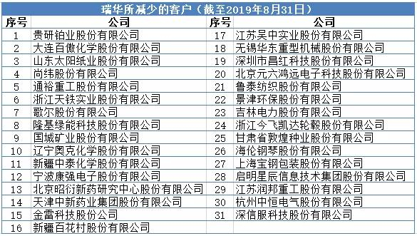 公司官网发布的数据显示,截至8月31日,公司服务的上市公司合计有288家。与瑞华事务所此前披露的清单相比,公司服务的上市公司减少了31家。其中25家上市公司对瑞华事务所的切割发生在8月份。