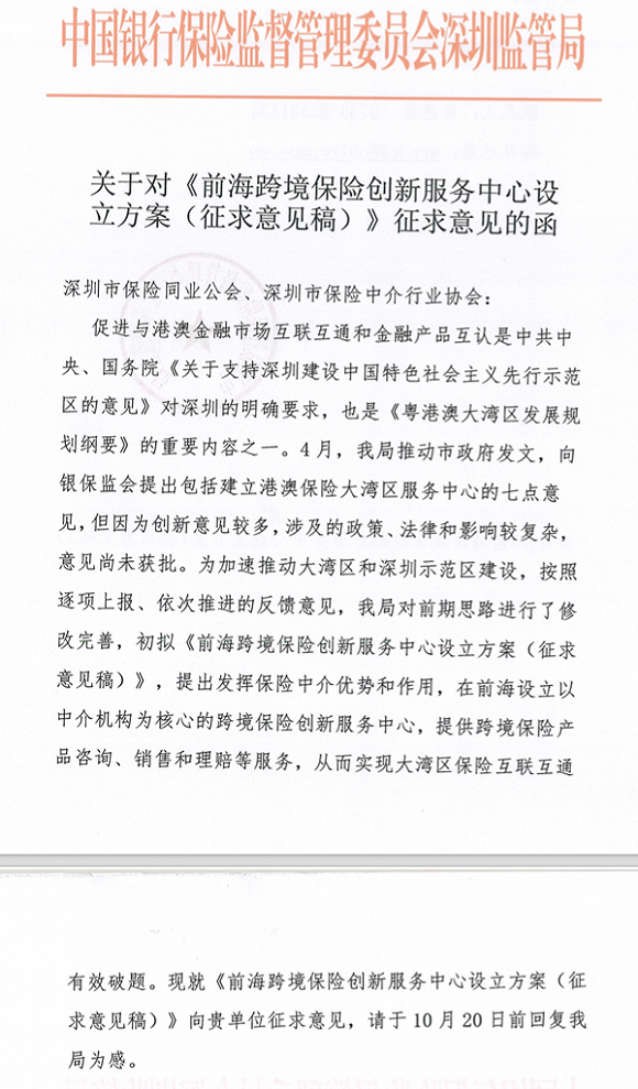 根据该征求意见函,初拟在深圳前海设立以保险中介机构为核心的一站式跨境保险创新服务中心,提供跨境保险产品咨询、销售和理赔等服务。