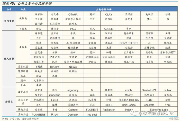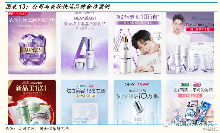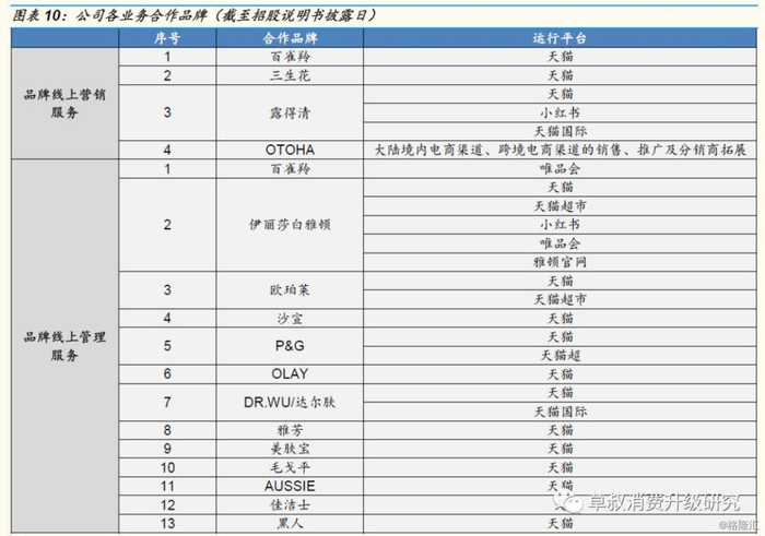 从合作品牌来看,目前公司已与宝洁、强生、百雀羚、资生堂、爱茉莉太平洋等国内外知名企业开展长期深入的电商合作:公司已经合作的品牌包括百雀羚、三生花、伊丽莎白雅顿、欧珀莱、OLAY 、 DR.WU 、沙宣、露得清、雅芳、美肤宝、赫妍、雪花秀、吕、艾诺碧、梦妆、兰芝等,并负责运营 P&G 集团在天猫的宝洁官方旗舰店(涵盖了海飞丝、潘婷、飘柔、护舒宝、舒肤佳、佳洁士、汰渍等十多个品牌)和天猫超市。