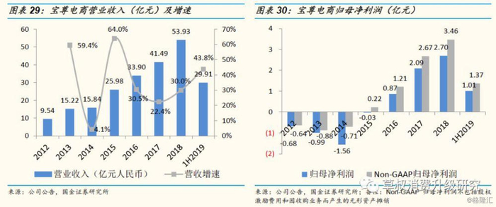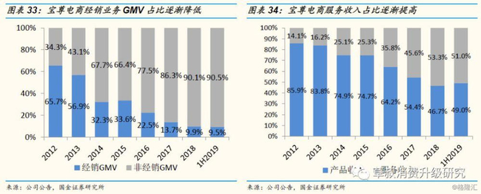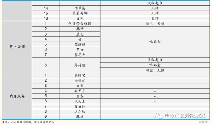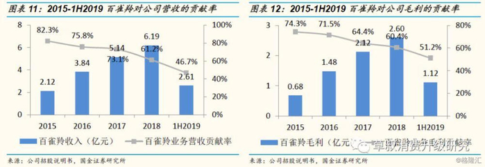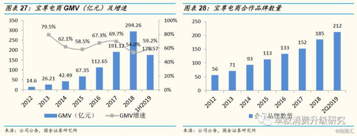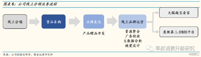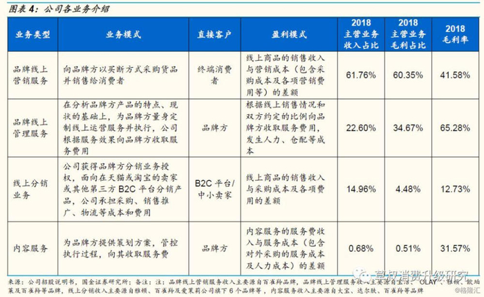 ④内容服务:指公司作为专业的电商服务商,具有品牌及消费者的洞察分析能力、创意策划能力、渠道整合和消费者触达能力,能够根据品牌特性与消费者诉求,运用创意营销方案来传达品牌的核心竞争力,并在娱乐渠道(直播平台、短视频平台等)、背书渠道(微信公众号、美妆博客等)、导购渠道(淘宝站内推广等)等多种渠道推广品牌及其产品,最终实现销售和品牌形象的塑造。公司根据与品牌方约定的服务内容,收取服务费。内容服务于2018年开始布局,2018/1H2019分别实现营收690/99万元,毛利率分别为31.6%/30.2%。