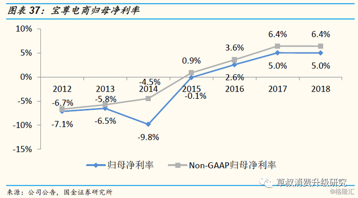 近年来,宝尊电商业务模式“由重转轻”,带动毛利率、Non-GAAP归母净利率实现大幅上升:2012-2018年,公司经销模式GMV占比由65.7%逐渐下降至9.9%,产品销售收入占比由85.9%下降46.7%,服务收入占比由14.1%提升至53.3%,表明公司营收来源逐渐由以经销模式为主的“较重”的产品销售收入转为以服务和代销模式为主的“较轻”对的服务收入。由于服务模式毛利率相较经销模式较高,公司毛利率由15.34%提升至62.27%,Non-GAAP归母净利率由-6.7%上升至6.4%。