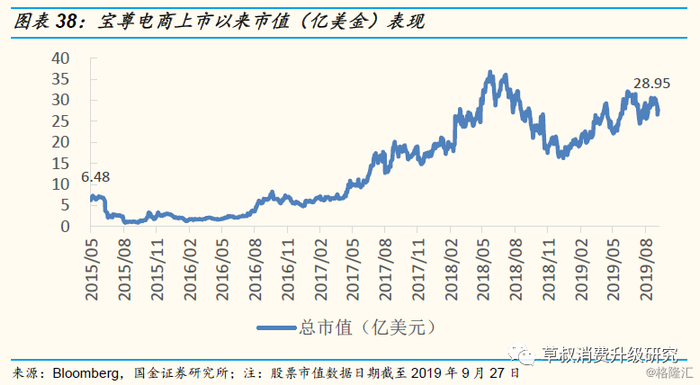 在强劲的业绩增长带动下,宝尊电商市值由2015年的6亿美金增长至2019年的28亿美金:2015年上市至今,在业务模式由重转轻、规模化效应显现的带动下,公司成功扭亏为盈并实现强劲的业绩增长,市值也增长了3.5倍。