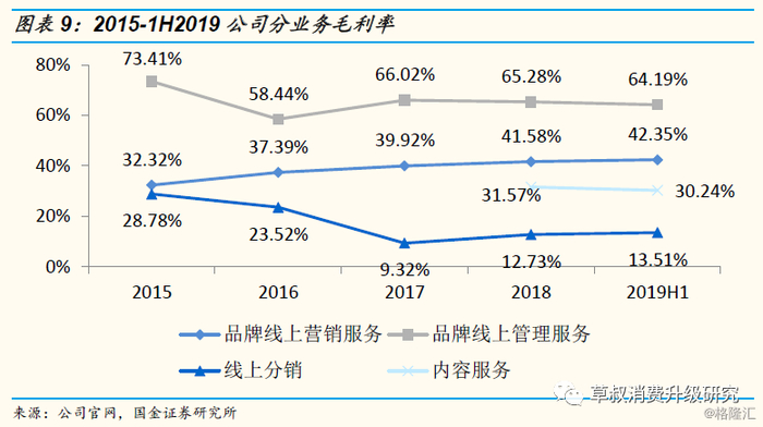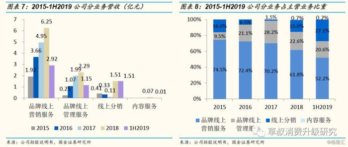 分业务来看,目前公司服务主要包括品牌线上营销服务、品牌线上管理服务、线上分销业务和内容服务四类:①品牌线上营销服务:2018年营收6.25亿元,营收占比61.76%;②品牌线上管理服务:2018年营收占比22.60%,毛利率65.28%;③线上分销业务:2018年营收占比14.96%;④内容服务:于2018年开始布局,2018年营收占比0.68%。