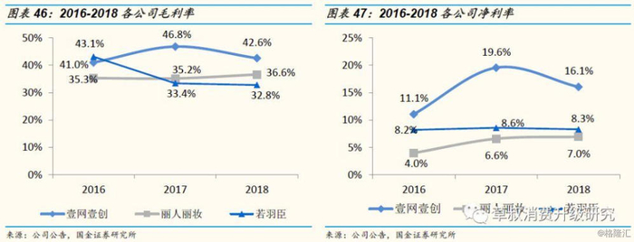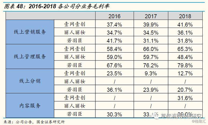 相同业务模式的毛利率水平相当,公司之间综合毛利率差异主要来自于不同的业务结构:2016-2018,壹网壹创的毛利率分别为41.0%、46.8%、42.6%;丽人丽妆的毛利率分别为35.3%、35.2%、36.6%;若羽臣的毛利率分别为43.1%、33.4%、32.8%。公司之间毛利率差异主要是各自业务结构不同,相同业务模式中,公司之间的毛利率水平相当。例如三家公司的线上营销服务毛利率在30%-40%,线上管理业务毛利率在60%左右,而线上分销业务毛利率在10%-30%,内容服务毛利率在30%-40%。