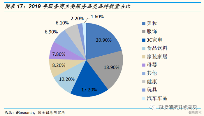 从品类角度来看,美妆、服饰和 3C 家电品类的服务品牌数量占比位居前三:根据iResearch数据,美妆品类作为消费升级的重点品类,在电商服务市场中占比最大,为20.9%。此外,服饰、3C家电、食品饮料、家装家居为占比较大的其他品类,分别为18.9%、17.2%、10.2%、8.2%。