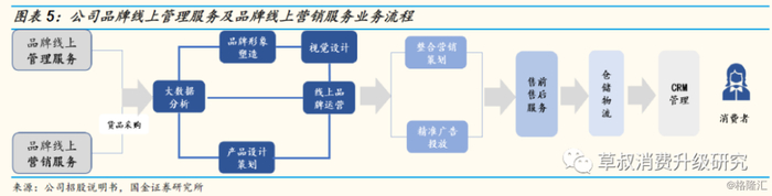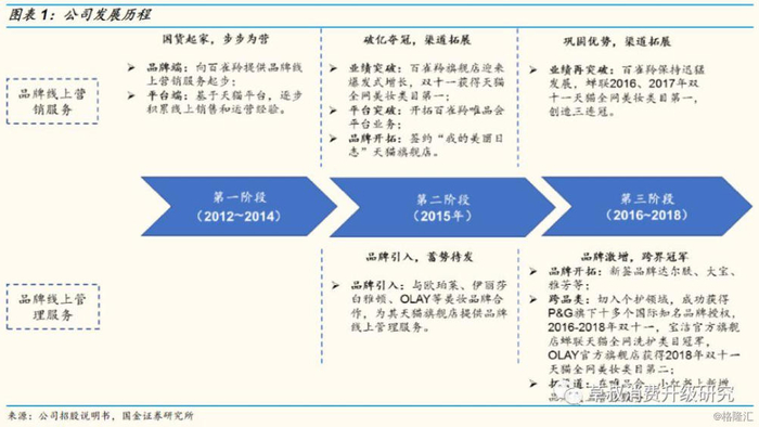 公司是专注于美妆&快消品领域的电商服务提供商:公司成立于2012年4月,以做国货化妆品第一品牌百雀羚的线上营销服务起步,经过7年发展,目前已成为国内领先、与多家国内外知名美妆品牌合作的电商服务运营商,并于2019年9月在A股创业板上市。作为美妆快消品牌方的重要战略合作伙伴,公司从品牌形象塑造、产品设计策划、整合营销策划、视觉设计、大数据分析、线上品牌运营、精准广告投放、 CRM管理、售前售后服务、仓储物流等全链路提供线上服务,帮助品牌方提升知名度与市场份额。