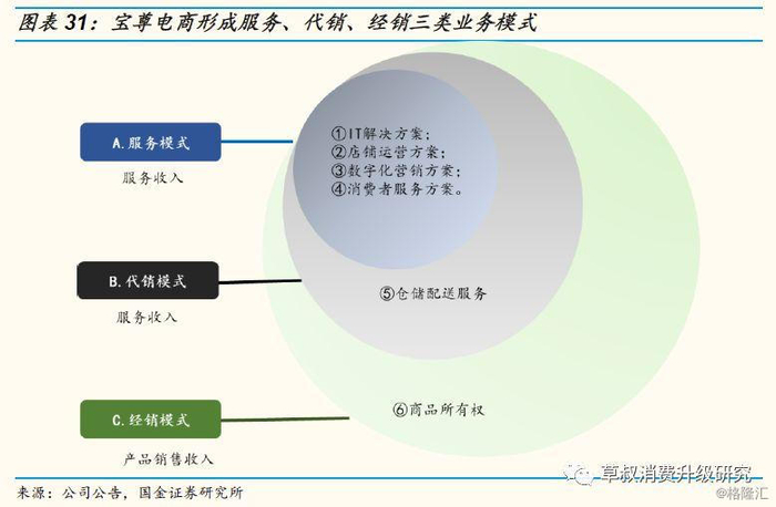 代销模式:在服务模式的基础上,获得品牌方代销授权,承担仓储、物流配送等服务,不拥有商品所有权,按照佣金比例获取服务收入。