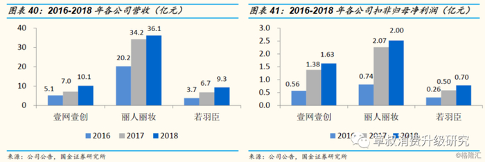 从营收规模来看:丽人丽妆主要从事化妆品零售业务,体量最大;从利润规模来看,得益于利润率较高的服务收入占比较高,公司利润体量处于行业中上水平。2016-2018年,壹网壹创收入由5.1亿元增长至10.1亿元,年均复合增速为41.3%;扣非归母净利润由0.56亿元增长至1.63亿元,年均复合增速为64.6%。丽人丽妆收入由20.2亿元增长至36.1亿元,年均复合增速为33.9%;扣非归母净利润由0.74亿元增长至2.00亿元,年均复合增速为64.6%。若羽臣收入由3.7亿元增长至9.3亿元,年均复合增速为58.1%;扣非归母净利润由0.26亿元增长至0.70亿元,年均复合增速为63.6%。