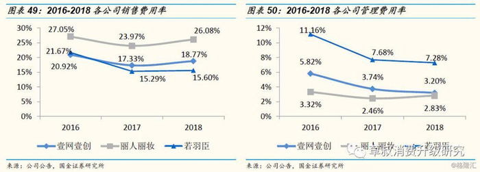 丽人丽妆90%以上收入来源于电商零售,因此销售费用率较高;若羽臣的分销业务占比在30%以上,拉低了整体的销售费用率。管理费用率中,壹网壹创与丽人丽妆较为接近,若羽臣较高,系其研发投入较高。