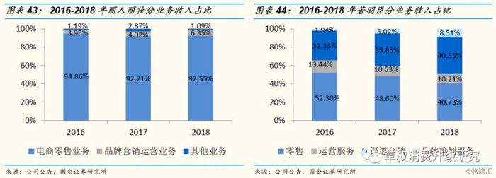 ③线上分销:指公司获得品牌方分销业务授权,面向在天猫或淘宝的卖家或其他第三方 B2C 平台分销产品,公司承担采购、销售推广、物流等成本和费用。业务流程主要包含了货品采购、品牌表达、线上品牌运营等,利润来源于销售收入与采购成本及各项费用的差额。公司得到品牌授权,负责百雀羚在唯品会平台、伊丽莎白雅顿在天猫、淘宝平台的线上分销,2018年获得爱茉莉公司旗下6个品牌在唯品会的线上分销业务。线上分销业务2015-2018年营收由0.41亿元提升至1.51亿元,毛利率在10%-28%之间波动。