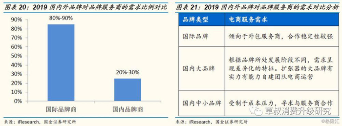 从品牌商需求来看,国际品牌商和国内中小品牌商对电商运营服务的需求较强:根据iResearch数据,国际品牌更倾向于外包服务商进行电商运营,且与服务商的合作稳定性较强;国内大品牌更倾向于自己组建电商部门开展线上业务,较少把电商业务外包给服务商;国内中小品牌受制于成本压力和运营能力,倾向于选择与电商服务商合作。