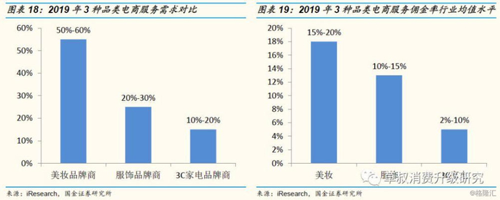 美妆品类对品牌电商服务需求比例相对较高且佣金比例较高:根据iResearch数据,2019年,美妆品类品牌的电商服务需求比例为50%-60%,高于服饰(20%-30%)和3C家电(10%-20%),美妆品类电商服务佣金率行业平均水平为15%-20%,也高于服饰(10%-15%)和3C家电(2%-10%)。美妆品类线上运营特点复杂,要求的运营技巧多,产品复购率较高,尤其在双十一、双十二等营销大促期间线上销量激增,因此使用电商服务较为普遍且行业佣金率平均水平较高。