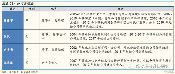 公司管理层由林振宇任董事长与总经理,卢华亮任副总经理,张帆任董秘,张滨滨为财务负责人。公司总经理林振宇2005-2007年任阿里巴巴(中国)有限公司福建区域市场部经理;2007-2010 年任淘宝(中国)有限公司营销中心市场部经理,2012年从阿里离职两年后,拿下了百雀羚在淘宝电商平台的销售代理权,开始了壹网壹创的业务经营。总经理林振宇、卢华亮均从公司创立初便任高管,具有较为丰富的行业经验。
