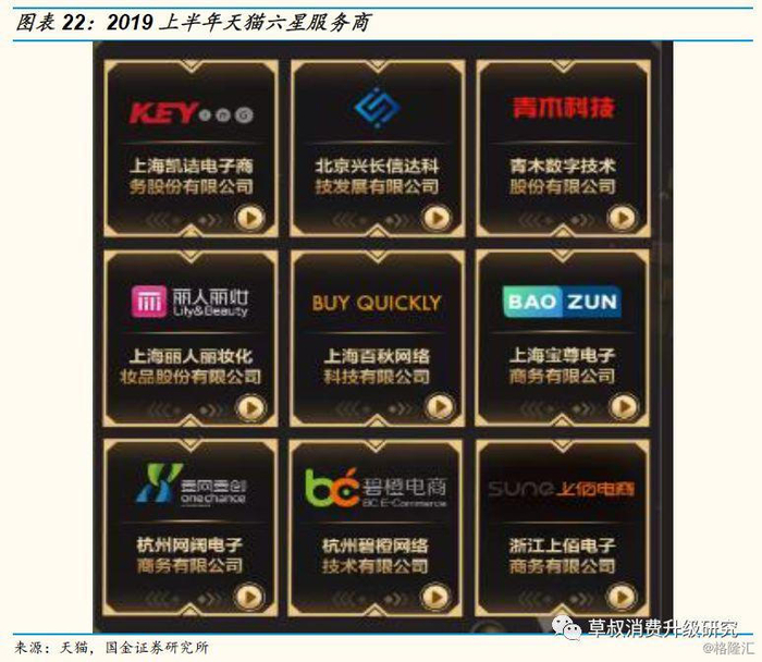 从行业格局来看,随着网购平台逐步规范代运营服务商,未来资源会向龙头品牌电商服务企业集中:以天猫为例,2018年平台认证服务商1000家,星级服务商310家,天猫制定了完善的电商代运营准入、评级等制度,对代运营企业提出了较高的要求,促使客户向大企业集中。从天猫公布的2019年上半年天猫星级运营服务商来看,被其评为“6星服务商”的代运营公司一共仅有9家,壹网壹创位列其中。我们认为,头部服务商的规模、数据积累、资金及供应链优势突出,具备较强的品牌建设能力、多元渠道布局能力,为品牌提升销量的同时,能够不断提升品牌影响力,满足品牌多元化的需求,未来头部电商服务商的竞争优势将更加明显。