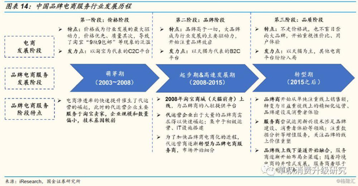 品牌电商服务行业在国内的发展历经了三个阶段,与电商行业的发展历程大致吻合:①萌芽期(2003-2008年):电商代运营崛起于以淘宝网为代表的C2C平台;②起步期&高速发展期(2008-2015年):天猫上线,越来越多的品牌商开始拓展电商渠道,电商代运营市场开始扩大;随着电商体量及B2C市场份额的逐步提高,代运营开始转型为电商服务;服务商数量快速增加,行业加速整合。③转型期(2015年以后):品牌商开始注重品质及用户体验,品牌电商服务行业开始重视发展新技术,逐步从简单的人力、劳务输出模式转为规模型、人才技术密集型模式,部分资质优秀的服务商通过上市或被收购的方式获得持续融资的能力。