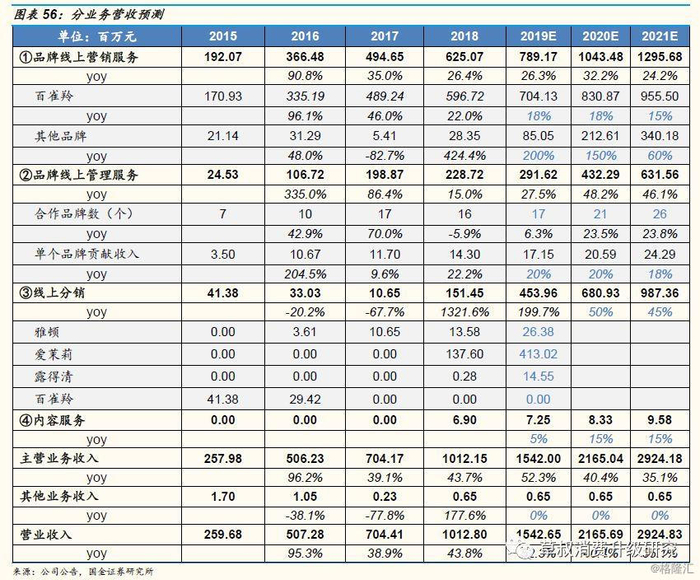 ①品牌线上营销服务:预计2019-2021年,百雀羚业务持续稳健增长18%、18%和15%,同时其他新品牌扩张有序,带动整个品牌线上营销服务业务同比增长26.3%、32.3%和24.2%。
