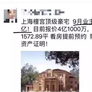 “上海第一豪宅”檀宫近期引发关注离不开中介们的功劳。不少中介在朋友圈及微博大肆宣传称,有业主直降1.4亿“甩卖”上海顶级豪宅,目前报价4.1亿元。