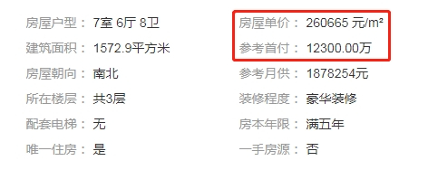 在此房产交易平台还可看到,出售的豪宅首付高达1.23亿,月供也需187万多。还不包含各项手续费、税费。