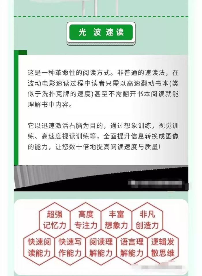 在一些号称“全脑教育”的教培机构口中,学过“量子波动速读”法后,只要5分钟就能读完10万字,并且还能复述书里的内容。