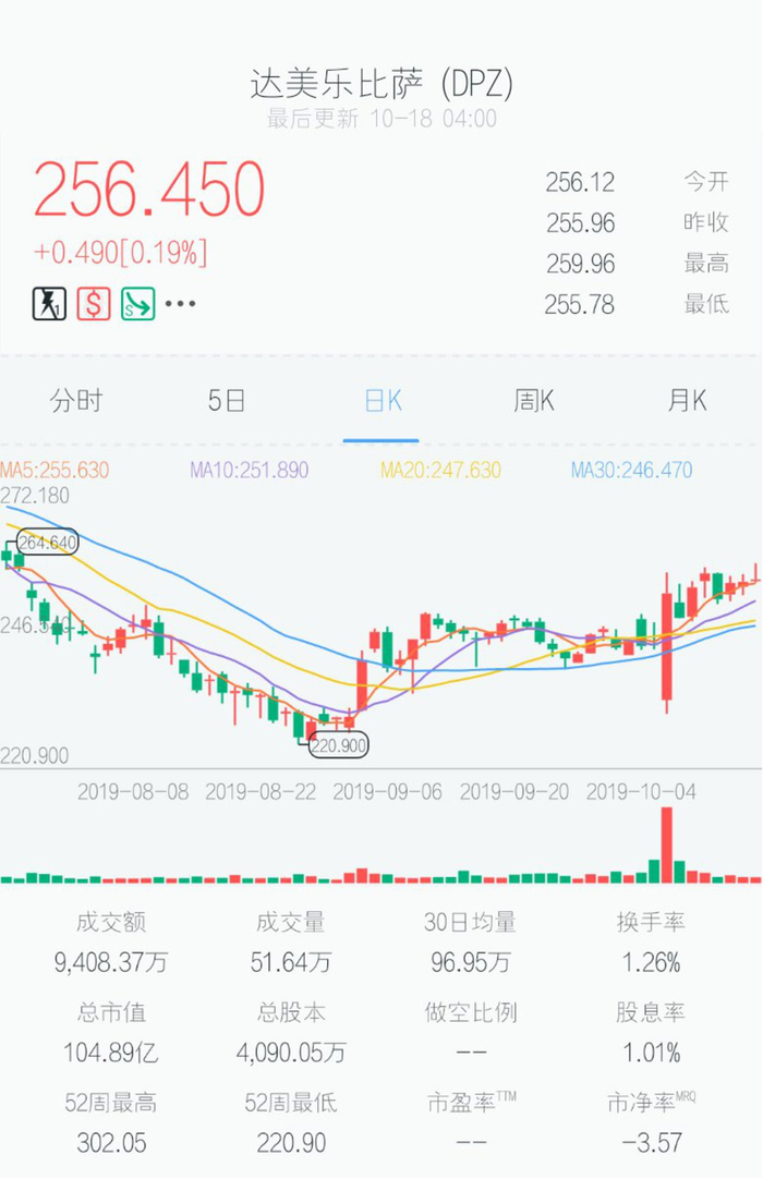 10月8日上午9:30,达美乐比萨低开4.83%,5分钟内股价触及日内低点227.50美元。