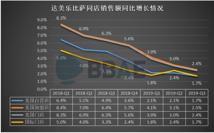 大环境不容乐观,达美乐的营收高增长难以为继,今年以来的连续三个季度营收均不及预期,近两个季度营收同比增幅更是低于5%,Q3单季营收也和预期相差578万美元。