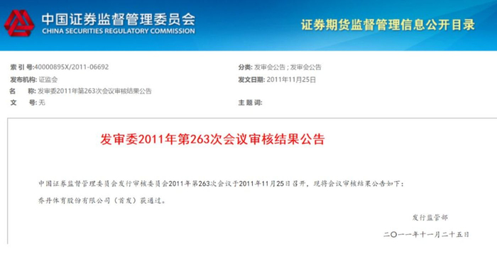 凭借这样的业绩,2011年11月25日乔丹体育顺利通过了中国证监会发审委2011年第263次会议审核,成功过会。