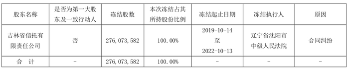 WEMONEY讯 10月18日,东北证券发布《关于持股5%以上股东股份被司法冻结的公告》(以下简称《公告》)称,近日,东北证券股东吉林省信托有限责任公司(以下简称“吉林信托”)通知,获悉吉林信托因与盛京银行股份有限公司合同纠纷诉前保全,其所持公司约2.76亿股股份已被司法冻结。截至公告披露日,吉林信托持有公司股份276,073,582股,占公司总股本的比例为11.80%;其所持公司股份累计被冻结的数量为276,073,582股,占公司总股本的比例为11.80%。公告显示,冻结起止日期为2019年10月14日至2022年10月13日。