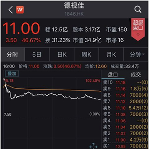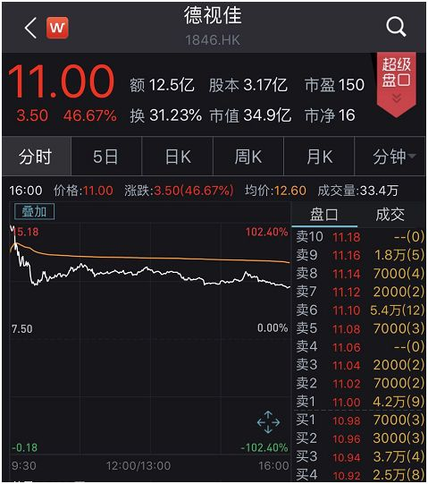 德视佳(1876.HK)开盘后股价暴涨102.4%,盘中最高涨至15.18港元/股,随后小幅回落,截至收盘涨近47%,每股均价12.60港元,一日总成交12.49亿港元,总市值近35亿港元。是近一周来继鲁大师(3601.HK)、鑫苑服务(1895.HK)后第三个首日最高涨幅超100%的公司。