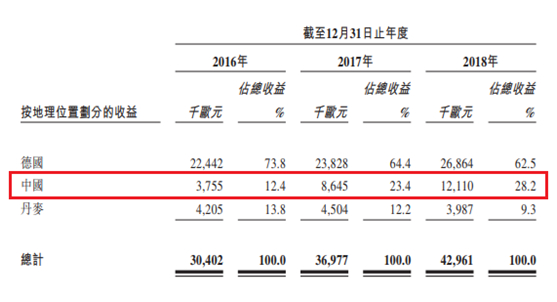 而相较于近三年营收占比不断下降的德国和丹麦,同期中国地区则表现优异。2016年至2018年的年度总收益为:12.4%、23.4%及28.2%,近三年德视佳在中国的收入从375.5万欧元大幅增至1211万欧元,完成三倍增长,扩张速度显而易见。
