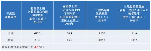 除此之外,全飞秒激光手术在中国的渗透率为每一百万名18至45岁的中低度近视患者668.5人,而德国渗透率则为1423.7人,是中国的2.1倍。后房型人工晶体(ICL)植入术在中国的渗透率为每一百万名18至 45岁的高度近视患者618.0人,而德国渗透率则为2651.1人,是中国的4.3倍。因此,德视佳得出的结论是中国存在一个庞大的未开发市场。