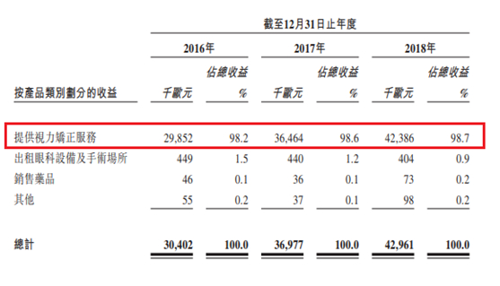可以说,视力矫正服务是德视佳当之无愧的核心业务。自2016至2018年,分别占该公司年度总收入的98.2%、98.6&和98.7%,呈连年上升态势,截至今年3月底比重升高至99%。