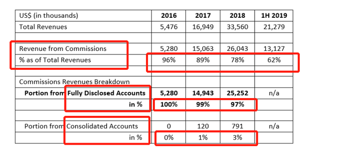如图所示,老虎证券的大部分收入都来自于证券交易佣金。2017年以来佣金收入占比逐年减少,但是今年一季度,佣金收入占比仍然达到六成以上。而就合并账户和全披露账户而言,至少在2018年末以前,老虎证券全披露账户收入占比超过95%。