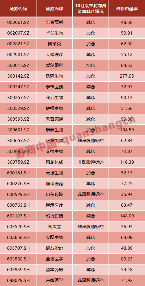 同是CRO公司,北向资金对昭衍新药、泰格医药略有减仓,对凯莱英加仓,或许也是因为昭衍新药、泰格医药的市盈率要高于凯莱英,昭衍新药的市盈率已达148.09倍,凯莱英为62.92倍。同时,10月以来,北向资金减仓市盈率54.48倍的益丰药房,加仓同为医药连锁的大参林,或是因为大参林的市盈率为41倍。这些变化可以看出,市盈率是北向资金仓位考量的因素。