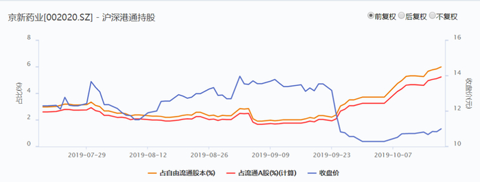 北向资金数据显示,就从9月24日跌停那天起,北向资金对京新药业连续加仓,截止10月18日,北向资金持股数量在流通股中的占比,由9月24日的2.39%增加到5.85%。