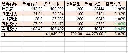 目前实盘已经买入片子癀和济川药业各200股,洋河股份伊利股份海康威视各100股,总成本4.18万元;未来两月计划投资1.8万元,完成全年6万元的本金投入。海康威视上周触发定投点,个人在“基少成多达摩院”介绍过,今天一涨又不符合条件了。