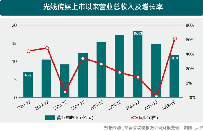 Wind数据显示,光线传媒的营业总收入从2011年的6.98亿元上涨至2017年的18.43亿元;2018年该数据下降至14.92亿元,同比下降19.09%。2019年上半年的营业收入达11.71亿元,同比增长62.37%;但归属于上市公司股东的净利润仅为1.05亿元,同比下滑95%,增收不增利情况明显。
