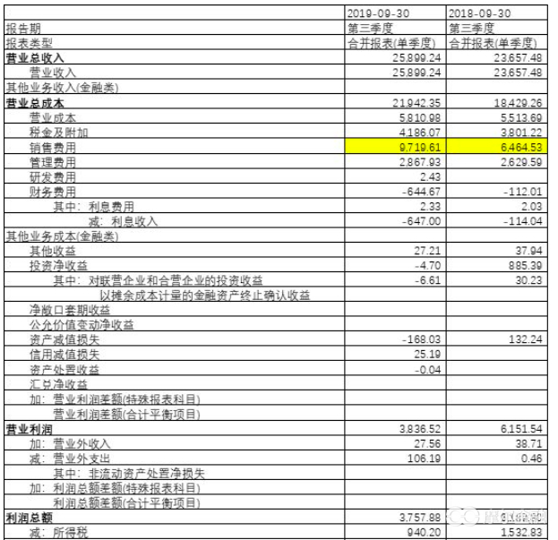 和上年同期数相比,主营收入单季增长9.5%,增幅不算太大但也尚可;其中增幅最大的是销售费用,增加了3300万,增幅超过50%,这也是导致净利润下降的主要原因。