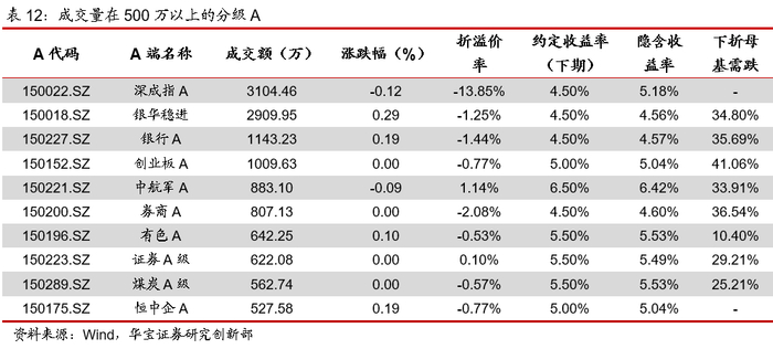 今日分级A全天总成交额1.14亿元,成交在五百万以上的分级A中,银华稳进(150018,+0.29%)、银行A(150227,+0.19%)、有色A(150196,+0.10%)和恒中企A(150175,+0.19%)上涨,深成指A(150022,-0.12%)、中航军A(150221,-0.09%)下跌。