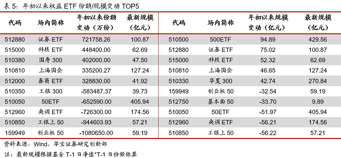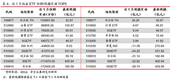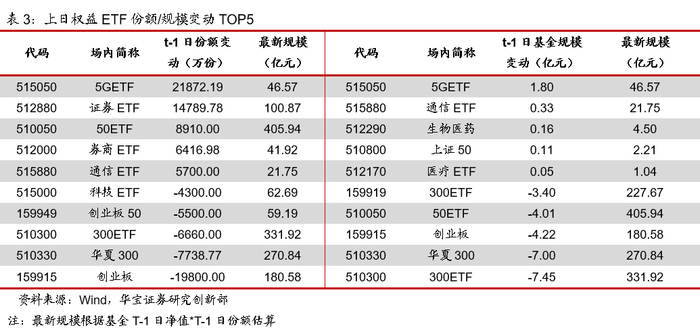 上周权益ETF总份额减少24.54亿份,总规模减少99.63亿元。从份额变动来看,5G通信、全指通信、中证军工、恒生国企指数、证券公司指数相关ETF合计份额分别净增加6.41亿份、1.08亿份、1.00亿份、0.69亿份、0.57亿份;创业板指、科技龙头、恒生指数、创业板50、MSCI中国A股相关ETF合计份额分别净减少9.42亿份、4.45亿份、4.30亿份、2.57亿份、2.19亿份。