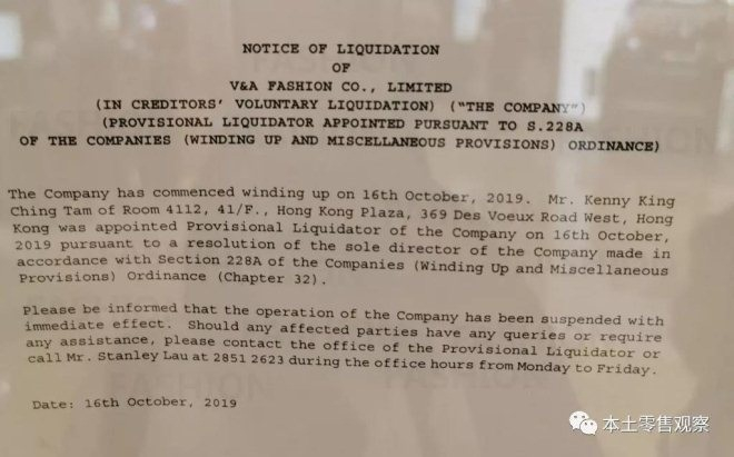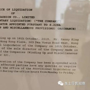 根据招贴,于10月16日根据香港《公司(清盘及杂项条文)条例》第32章,V A FASHIONCO., LIMITED已经破产清盘,即时生效,同时聘请谭竞正会计事务所担任临时清盘人,处理后续事宜。