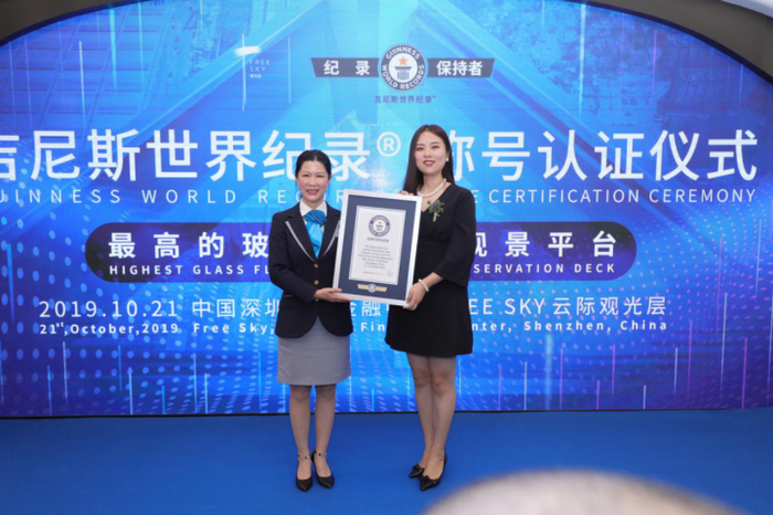 活动现场,Free Sky云际观光层悬空玻璃观景台荣膺吉尼斯世界纪录“最高的玻璃底悬挑观景平台”称号,这是深圳平安金融中心摘得的又一国际殊荣。今年4月,凭借先进的设计理念与卓越的项目品质,深圳平安金融中心斩获“世界最高办公建筑”“中国华南地区最高建筑”“2019年最佳高层建筑杰出奖”三项权威认证,以及2019年度全球400米以上最佳建筑奖。
